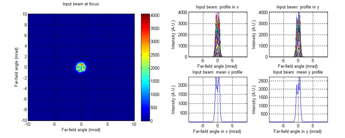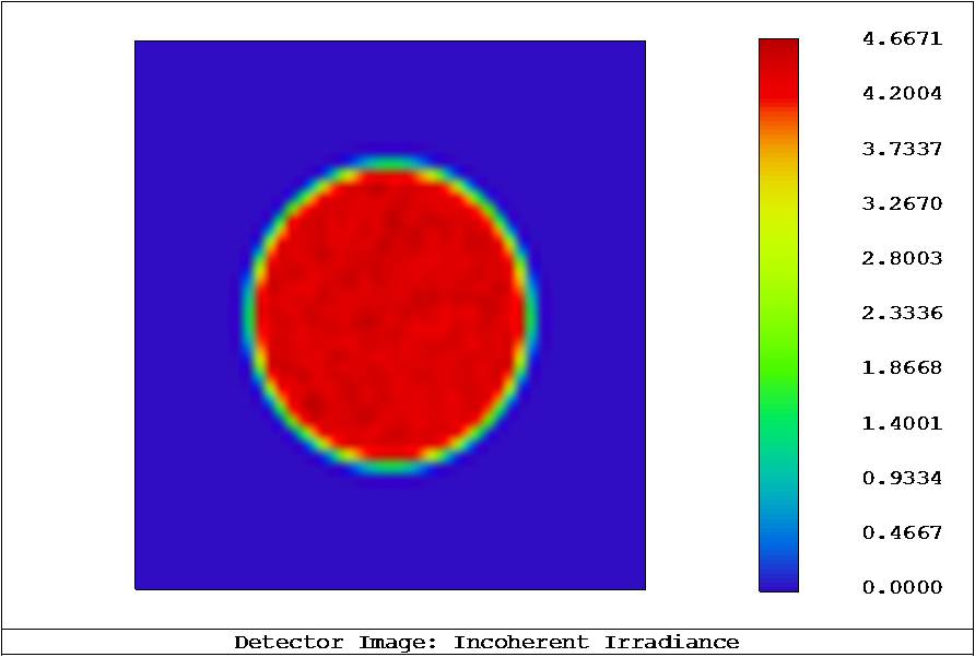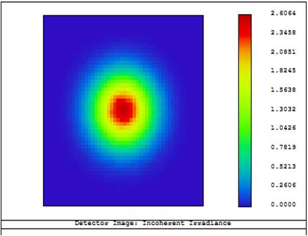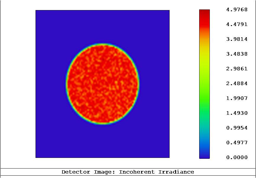 These beamshapers were designed to transform a Gaussian input beam into a flat top beam in the far field. An experiment was carried out by PowerPhotonics to test the performance of the beam shaper. The source was a fiber-coupled red diode laser, wavelength 635nm, delivered via a 1m fibre with a core diameter 62.5µm and NA 0.275, resulting in a beam diameter of approximately 11mm after the collimating lens. The modal properties of this source are particularly ugly, as shown in Figure 8. The output beam exhibited strong speckle, which was very sensitive to movement of the delivery fiber. This is a typical result of launching a spatially coherent source into an overmoded fibre.