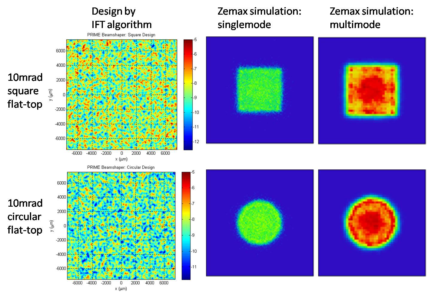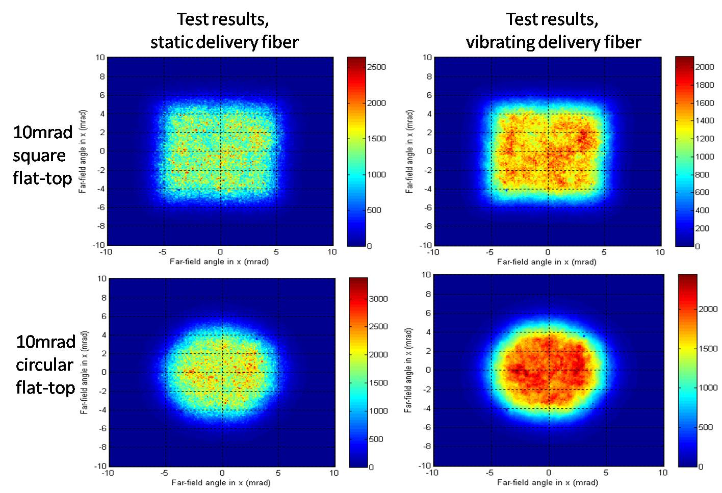 The output beam generated by the beamshaper is shown in Figure 9. The first column shows the output beam with a static delivery fibre. The design beam profiles are produced as intended, with a fine speckle structure superimposed, due to the high spatial coherence of the source. A source of lower coherence (uniform mutually incoherent filling of fiber modes) was simulated by vibrating the fiber. The result is shown in the second column of Figure 9. This shows a much smoother output intensity profile. Despite the poor correspondence between the Gaussian beam used in the design and the actual input beam, the beamshaper succeeded in generating a good quality flat top output beam.